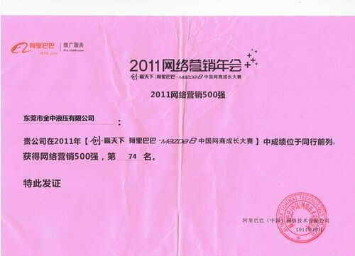 就在金中成立的第二年,即2011年,金中代表参加2011网络营销年会,荣获2011年网络营销500强证书,高居第74名,对于在液压行业初露头角的金中来说,这是一个非常不错的发展机遇和资质证明!就在不久后,金中有荣获了中国互联网新闻中心颁布的“中小型网络名企”的荣誉证书!金中的成长,大家都看在眼里!