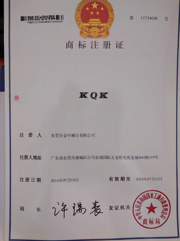 起初的金中液压有限公司还是稚嫩的小毛孩,继而在2014.07.14,东莞金中注册的“KQK”品牌终于得到了由中华人民共和国工商行政管理总局商标局颁发的商标注册证!您瞧!