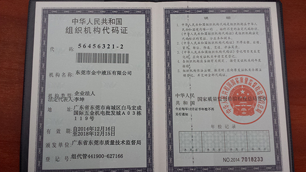 金中人一直在努力,也正因为着金中人的努力,金中在成长的道路上,一直都得到社会各界的认可!东莞金中液压有限公司的液压产品一直用的都是台湾进口的配件,在液压行业来讲,国外的液压技术相对于国内是比较有优势的,所以金中的产品一直得到广大新老客户的认可和信赖,在业内也树立了好的榜样!这也就赢得了广东省东莞市质量技术监督局的亲觅!东莞市质量技术监督局于2014.12.16日向东莞金中颁发了组织机构代码证!